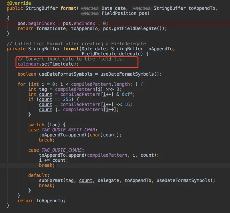 我们跟一下SimpleDateFormat类中format方法的实现其实就能发现端倪。