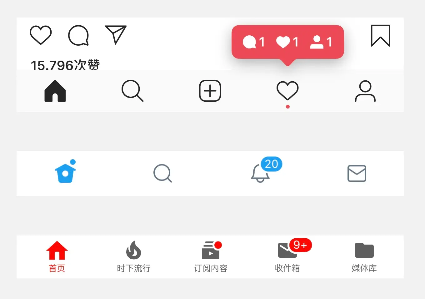 而在海外产品中,要找到我们所指的「小红点」不容易,在带有社交功能的产品中可以常见数字提示的「Badge」,也就是通知数,如果出现了小点点,从产品含义上也很容易直观的了解到它的含义,大部分场景是用于提示有新变化,比如 Twitter 的时间线如果有更新,会有个蓝色的小 Badge,又比如 Youtube 的订阅内容如果有新内容出现,也会有个红色的小 Badge。