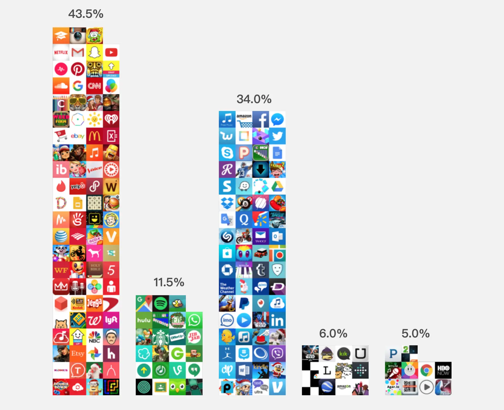 有人统计了2015年 App Store 免费榜下载的前200个产品的 icon 颜色,将它们分类成红色系、绿色系、蓝色系以及黑白灰色系。可以看出在全世界范围内,和国内一样,红色系和蓝色系的产品依旧是最安全的选择。如果再做细分的话,橙色、黄色、粉色、紫色等颜色也不罕见,这与国内产品纷纷扎堆选择「科技蓝」与「喜庆红」形成了反差,在国内的前100名产品中只有5款绿色产品而根本找不到黑白灰色系的产品。这时不难得出一个结论:倘若你的产品想从 App Store 列表中快速区别于其他产品,选择绿色或者黑白灰色系不失为一个机智的选择。