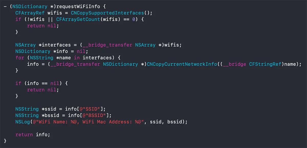 在一些特定业务场景下,我们需要获取 iOS 设备所连接的 WiFi 的信息,比如 WiFi 的 SSID(即 WiFi 的名称),WiFi 的 BSSID(即 WiFi 的路由器的 Mac 地址)等,相应的代码也很简单,大致如下图所示: