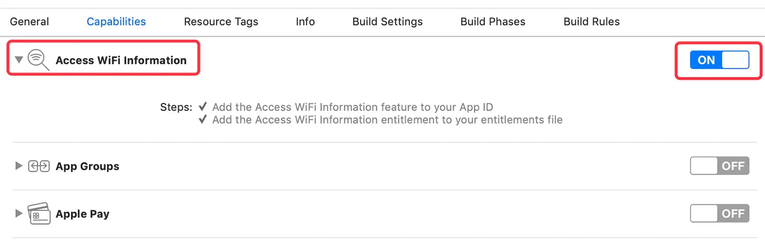 大致意思是说:在 iOS 12 及以上系统调用该方法时,需要先在 Xcode 工程中授权获取 WiFi 信息的能力,开启路径为:Xcode -> [Project Name] -> Targets -> [Target Name] -> Capabilities -> Access WiFi Information -> ON,如下图:
