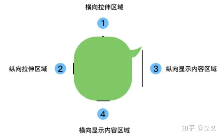 点九图格式规定由左侧和上侧来控制图片的拉伸,右侧和下侧控制文字的显示区域。