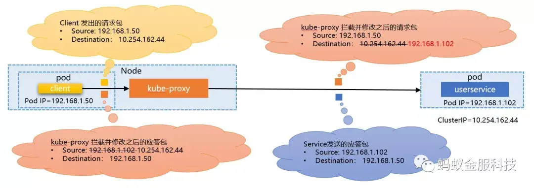 应答回来的方式类似,userservice发出的应答报文会被 kube-proxy 拦截并修改为发送到客户端所在的 pod IP。