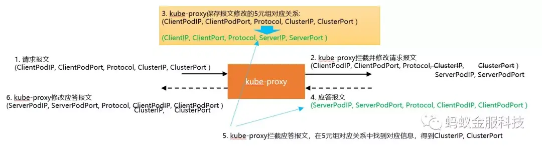 在拦截并修改请求报文之后,kube-proxy 会保存报文修改的5元组对应关系(5元组指源 IP 地址,源端口,协议,目的地 IP 地址,目的地端口)
