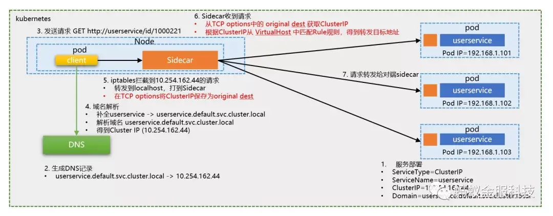 当部署在 k8s 下的某个充当客户端的应用发起请求时,如图中的 HTTP GET请求,目标 URL 地址为 “http://userservice/id/1000221"。请求的寻址方式和过程如下: