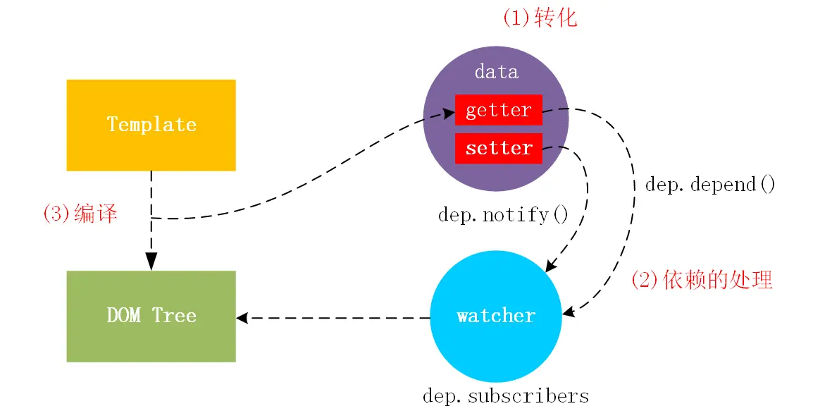 - 依赖的处理:对数据的依赖进行存储,收集和触发