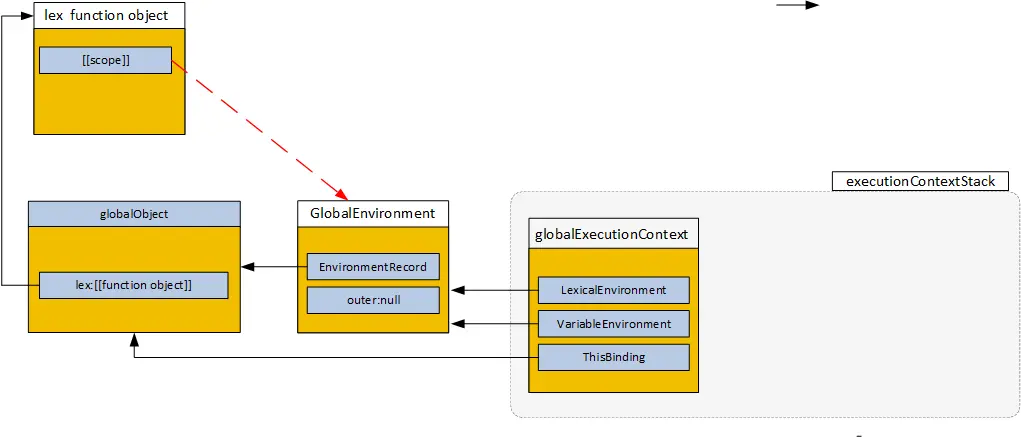 /** * 运行环境模型伪代码 */ var funname = lex; var funcbody = "console.log('lexical')"; var argumentlist = []; //currentLexicalEnvironment这时其实就是全局词法环境GlobalEnvironment var currentLexicalEnvironment = Runtime.getRunningExecutionContext().VariableEnvironment; var fo = FunctionCreate(argumentlist,funcbody,currentLexicalEnvironment,strict) //currentLexicalEnvironment 最后保存到函数对象的内部属性[[scope]]。 currentLexicalEnvironment.EnvironmentRecord.initialize('lex',fo);这时看起来像这样: