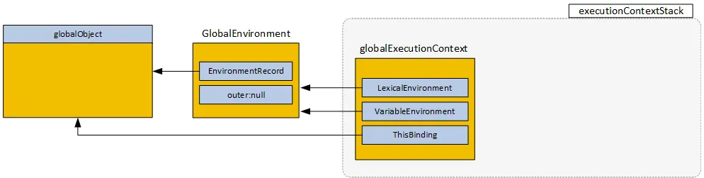 /** * 运行环境模型伪代码 */ var globalExecutionContext = new ExecutionContext(); globalExecutionContext.LexicalEnvironment = GlobalEnvironment; globalExecutionContext.VariableEnvironment = GlobalEnvironment; globalExecutionContext.ThisBinding = globalobject; Runtime.push(globalExecutionContext); //这时的Runtime Runtime = { executionContextStack: [globalExecutionContext]; }; -