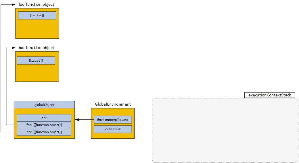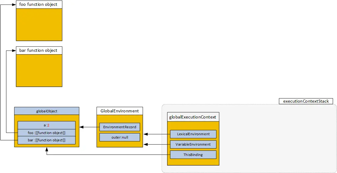 当foo中执行语句:“console.log(a)”时候,会去当前的词法环境查找a,图中可以看出,当前词法环境是空的,因此就找当前词法环境的outer---也就是函数创建时的词法环境(保存在函数内部属性[[scope]]中),也就是全局词法环境,找到了a:2,因此打印2。