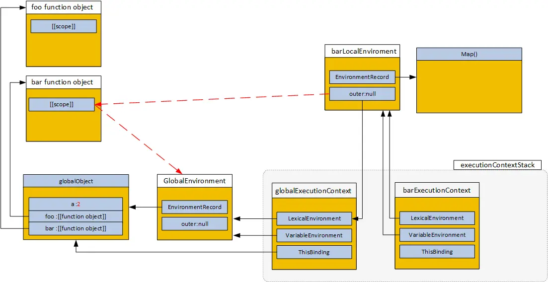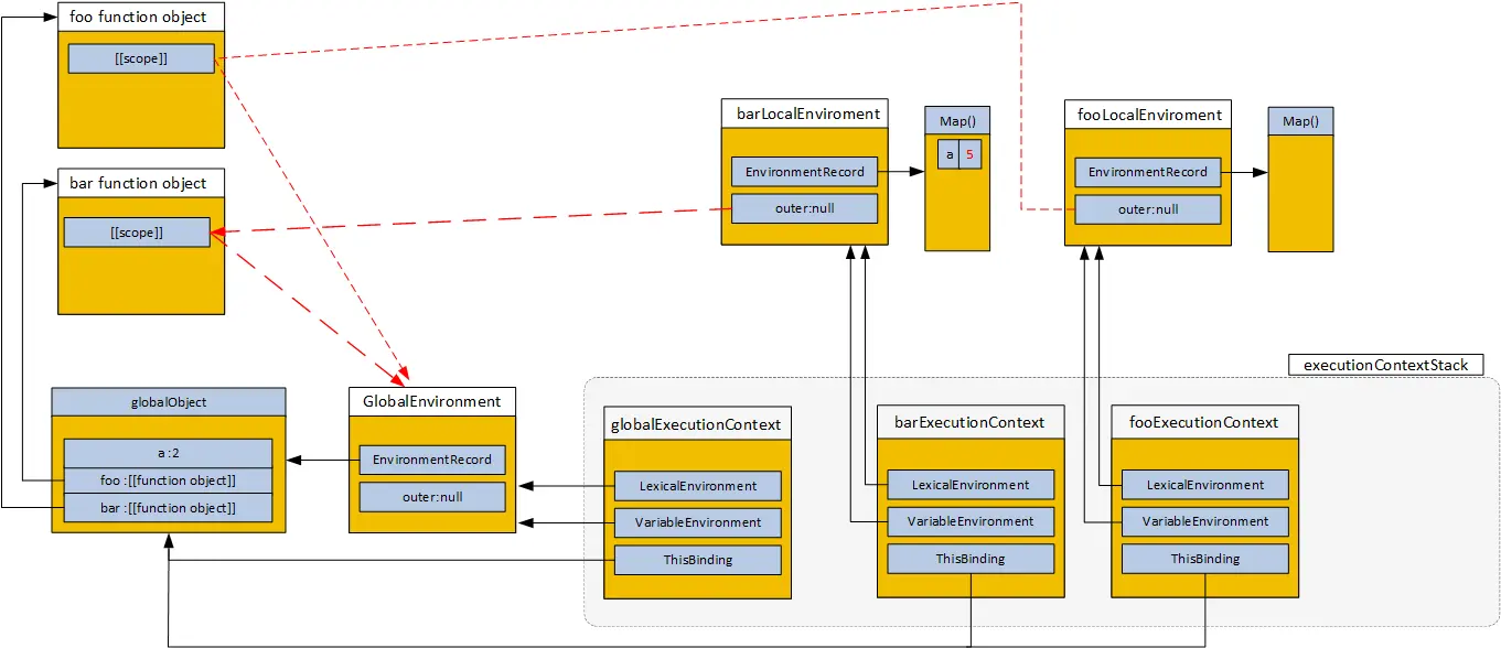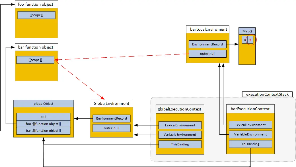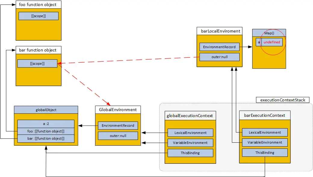 图中虚线的意思,就是outer的实际的指向。函数运行时候的词法环境的outer指向了函数创建时的词法环境。而我们知道bar函数在全局运行上下文上创建的,创建时的词法环境为全局词法环境(GlobalEnvironment)。因此outer实际是指向全局词法环境。