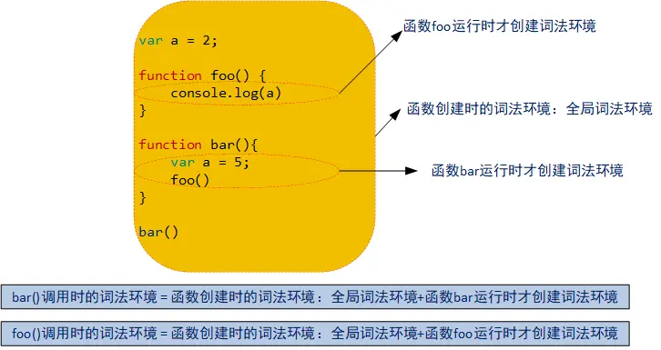 从图中,我们看一看出,foo运行时的词法环境和foo刚刚被调用那时刻的词法环境没关系。只和它创建时的词法环境相关。