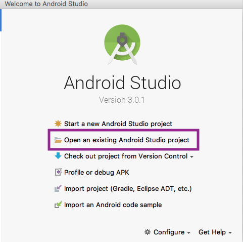 如果你看到欢迎页面,单击 打开已有的 Android Studio 项目。