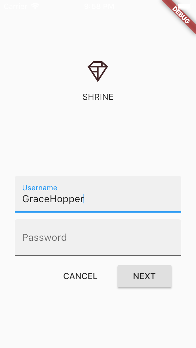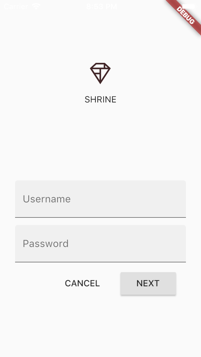 成功!Shrine 的初始登陆代码应该在你的模拟器中运行了。你可以看到 Shrine 的 logo 和它下面的名称 "Shrine"。