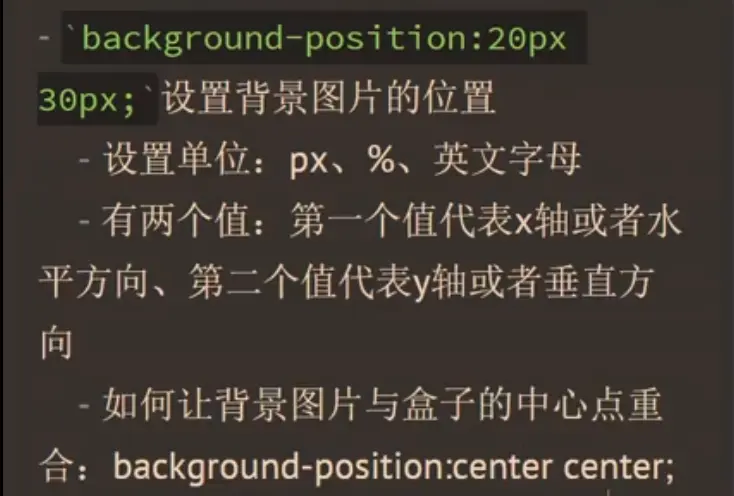 - background-position:背景图片的位置,让图片在盒子居中,center、center或可以是具体的像素或可以是百分比或者可以是top、right、bottom、left