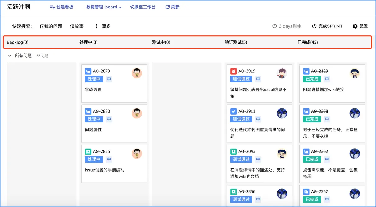 Choerodon敏捷管理中的活跃冲刺看板可以用来进行开发迭代任务可视化管理,每个任务下的子任务、经办人、任务状态、任务类型都在看板中显示,每一个开发人员都可以看到团队开发的流程进度。