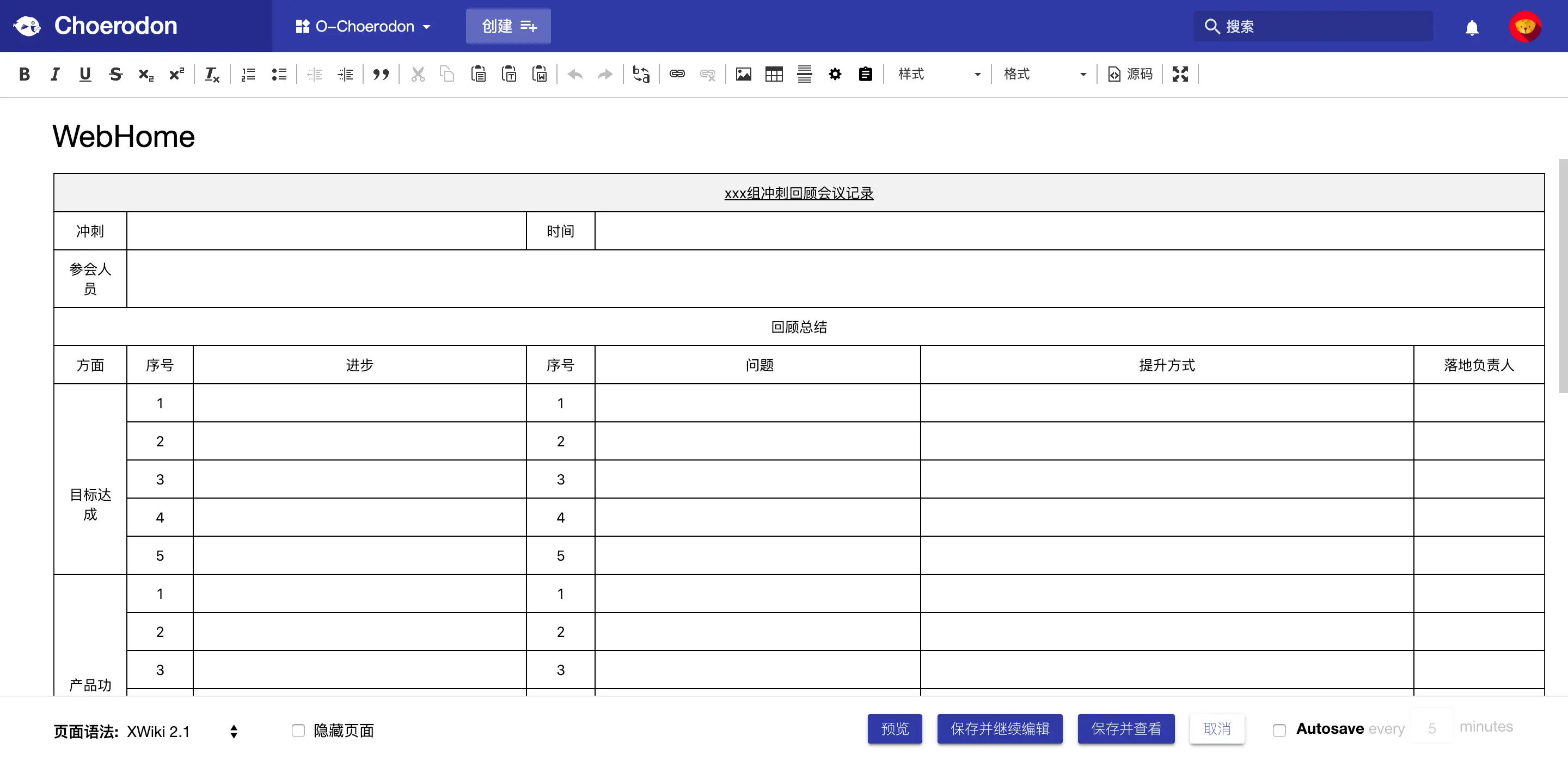 在进行敏捷回顾会议时,开发团队会使用Choerodon猪齿鱼Wiki管理中进行会议记录,创建时使用“敏捷回顾会议记录”的文档模板,可进入已经设置好的回顾会议文档编辑页面。