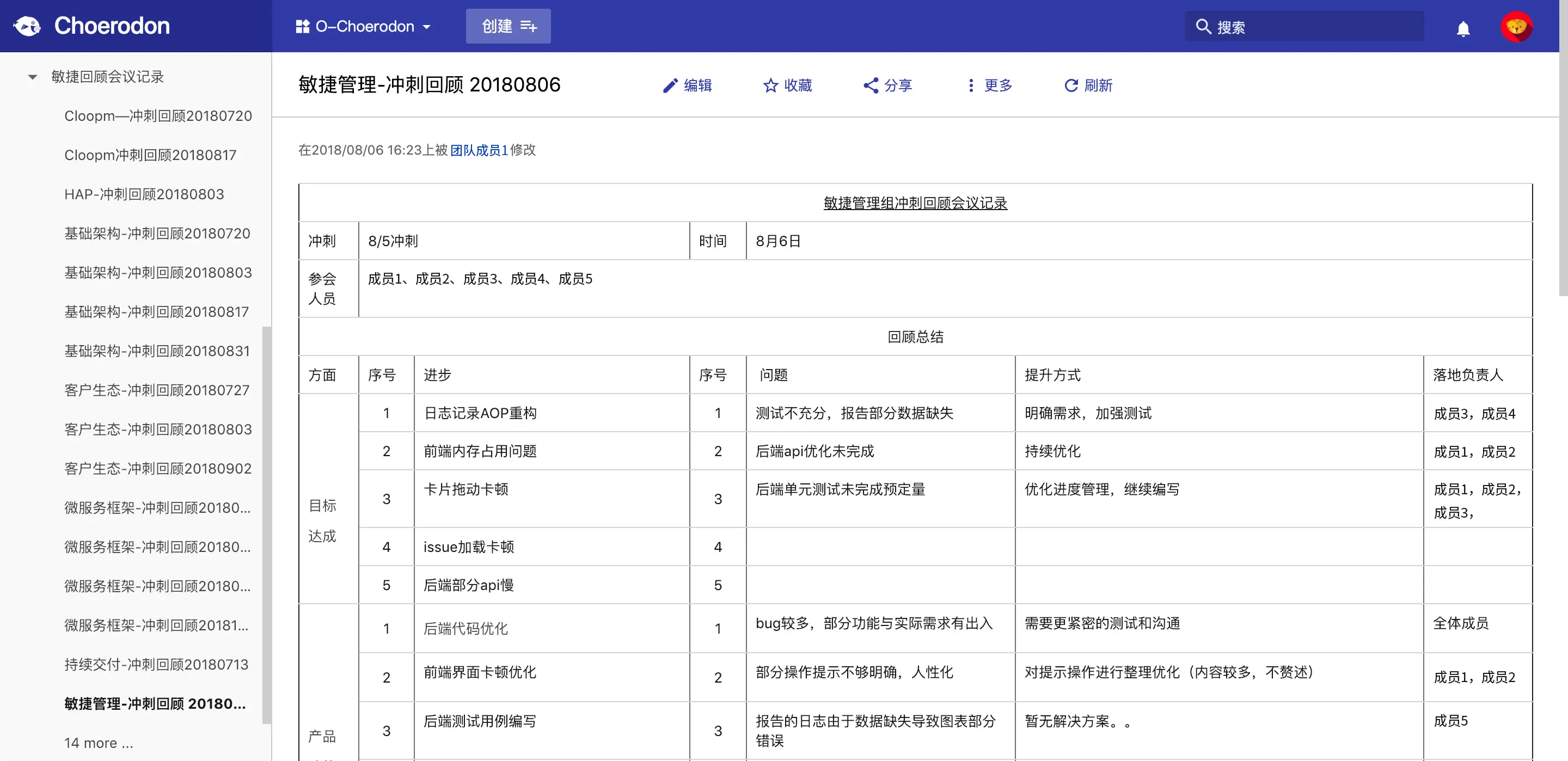 在Choerodon猪齿鱼知识管理中的回顾会文档,可以记录开发团队关于每个迭代的各种问题的思考,帮助团队不断调整敏捷实施方案,突出敏捷开发的效果。