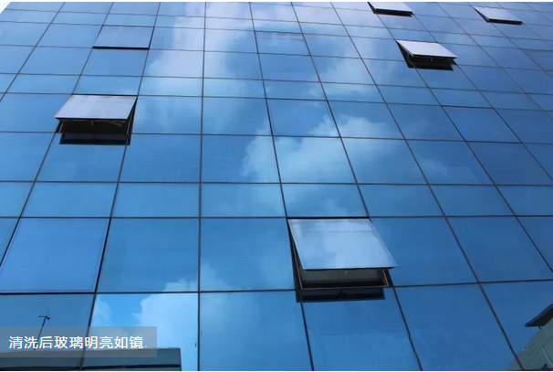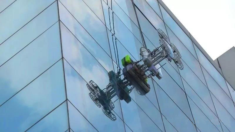 机器人从高处缓缓的下移,经过之处焕然一新,左侧清洗过的墙面与右侧未清洗的玻璃形成鲜明对比。这款机器人清洗时的效率约每小时120平米,按照工作10小时计算,一天可以清洗1200平米的面积,而且工作一小时仅需0.5度电,用5升水就能清洗100平米的楼宇外立面,既安全高效,又节能环保。