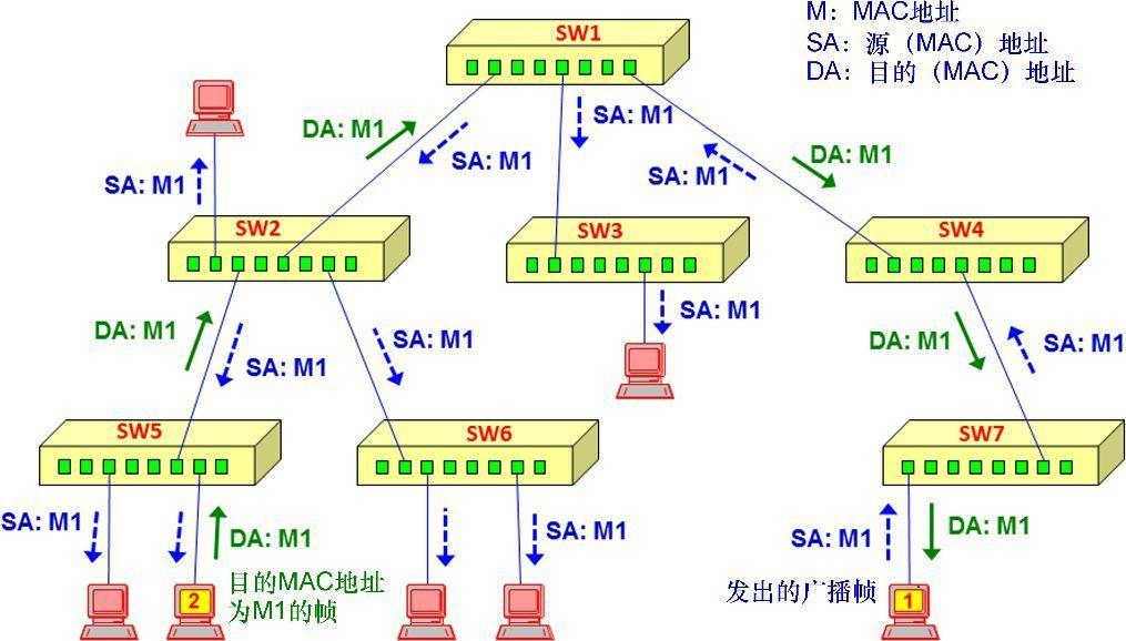 当PC2要将一帧发给PC1时,该帧会被先发给直连PC2的交换机SW5。SW5已从左起第6个端口学到了PC1的MAC地址M1,即该帧的目的MAC地址。同理,网络内的每台交换机都会通过学到M1的端口外发该帧,直至其最终抵达PC1。