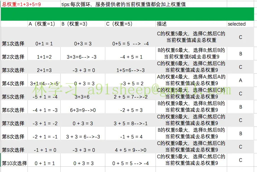 假设有三个服务提供者A,B,C,权重分别为1:3:5 (相同权重不讲了,按列表顺序从前往后循环就行了)。