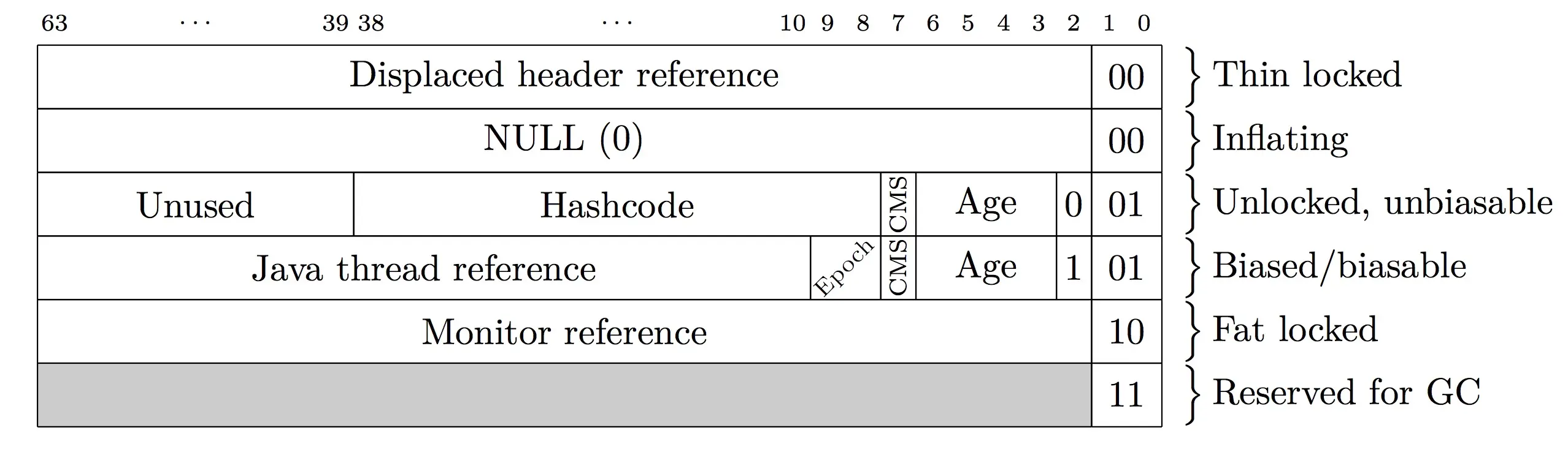 线程ID直接指向JVM内部表示的线程;java虚拟机中则是在最后3bit填充0x5表示偏向模式。