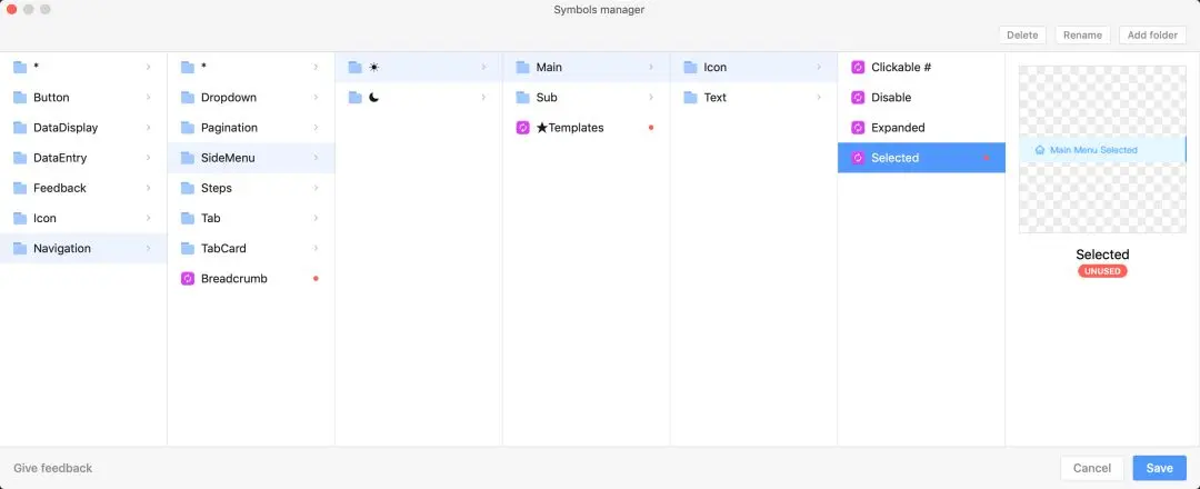 但仅仅解构分类是不够的,想要完成一整套 Symbol 组件库,还需要将解构后的组件拆分为单独的元素 Symbol,以方便嵌套并组成 Symbol 组件。