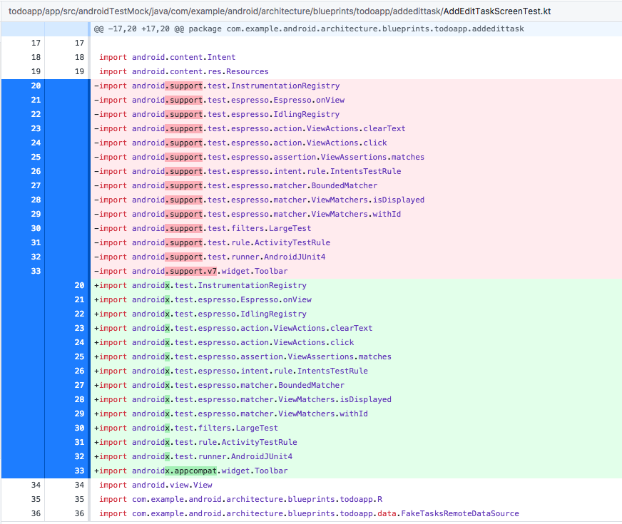 android.useAndroidX=trueandroid.enableJetifier=trueIn general, the changes should be isolated to just these 3 areas, but in my experience, I have seen the refactor tool also make other changes. In my case, the tool added code to account for Kotlin Nullability (it added a few !! in my source code), but there likely will be other changes. It is a really good idea to closely monitor all the changes the tool makes, and ensure you are comfortable with them.