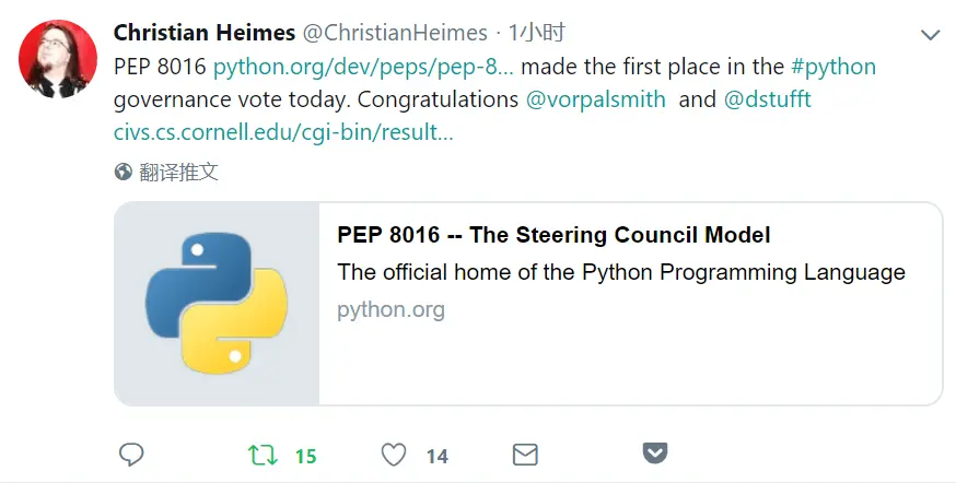 在几天前,我们推文《最新进展|关于Python治理模式的投票》,已经很明白地预测了这个结果,现在得到了证实。毫无悬念。