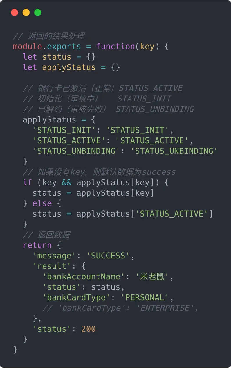 2、我们看到有段注释// 'bankCardType': 'ENTERPRISE',,我们依然用了传统的注释,解注释方式来切换返回数据。因为,我们之前说过mock-management-page可以发起ajax对应的status是单一的。如果我们一定要把它变为可切换方式,我们不得不这么写: