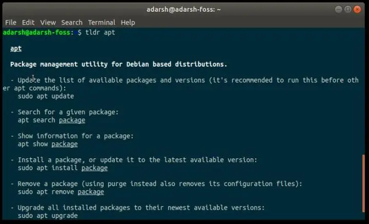 让我们再举一个例子,向你展示 TLDR 页面为 apt 提供的内容: