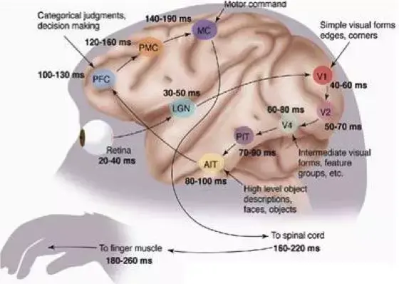 上图表示人理解外界视觉信息的过程。从视网膜(Retina)出发, 经过低级的 V1 区提取边缘特征,到 V2 区的基本形状或目标的局部,再到高层的整个目标(如判定为一张人脸),以及到更高层的 PFC(前额叶皮层)进行分类判断等。也就是说高层的特征是低层特征的组合,从低层到高层的特征表达越来越抽象和概念化,也即越来越能表现语义或者意图。