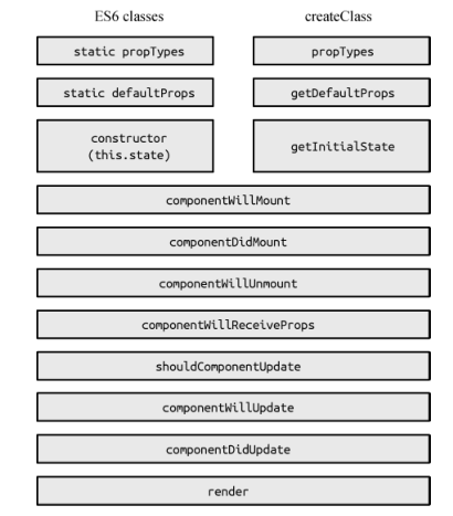 下图是使用 ES6 classes 与 createClass 构建组件方法的异同: