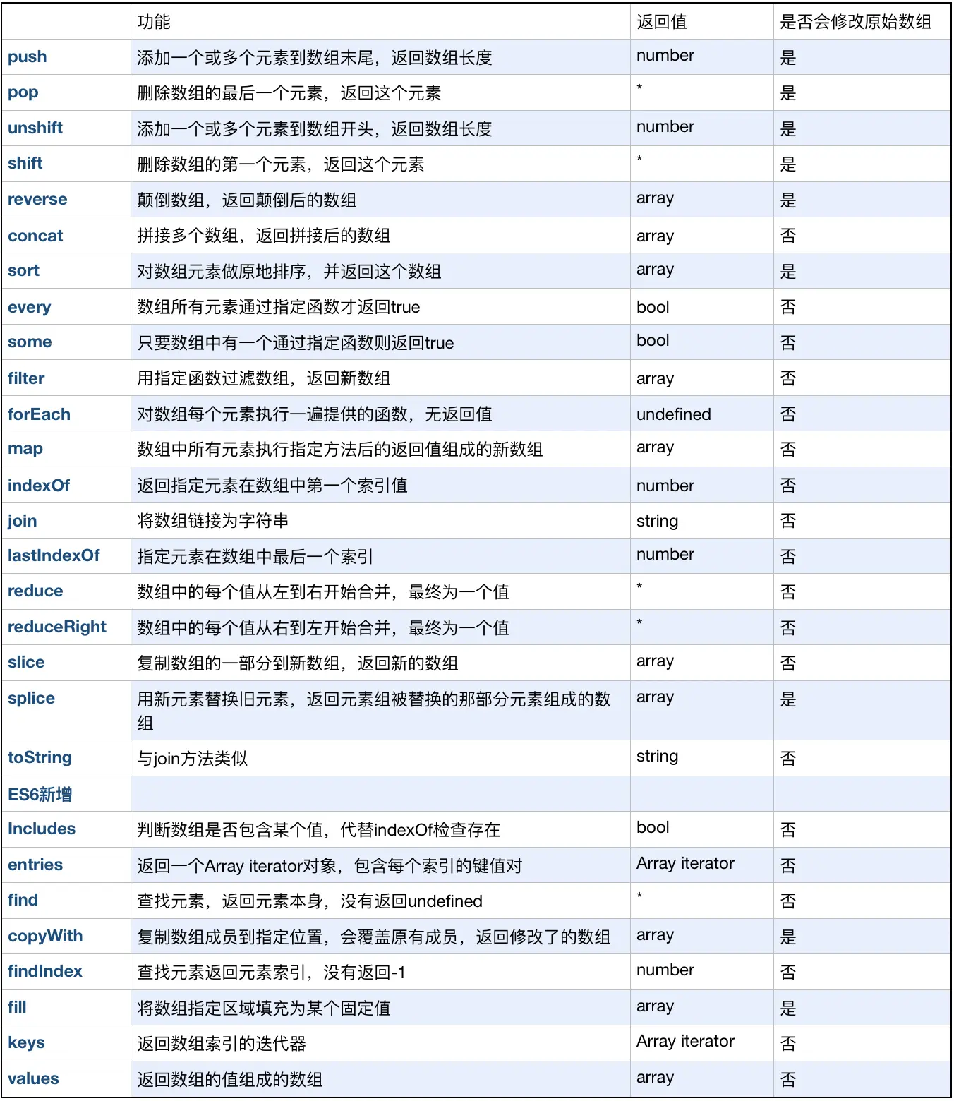 下面用表格列出来所有方法的功能,返回值,是否会修改原数组,方便查阅,值得保存