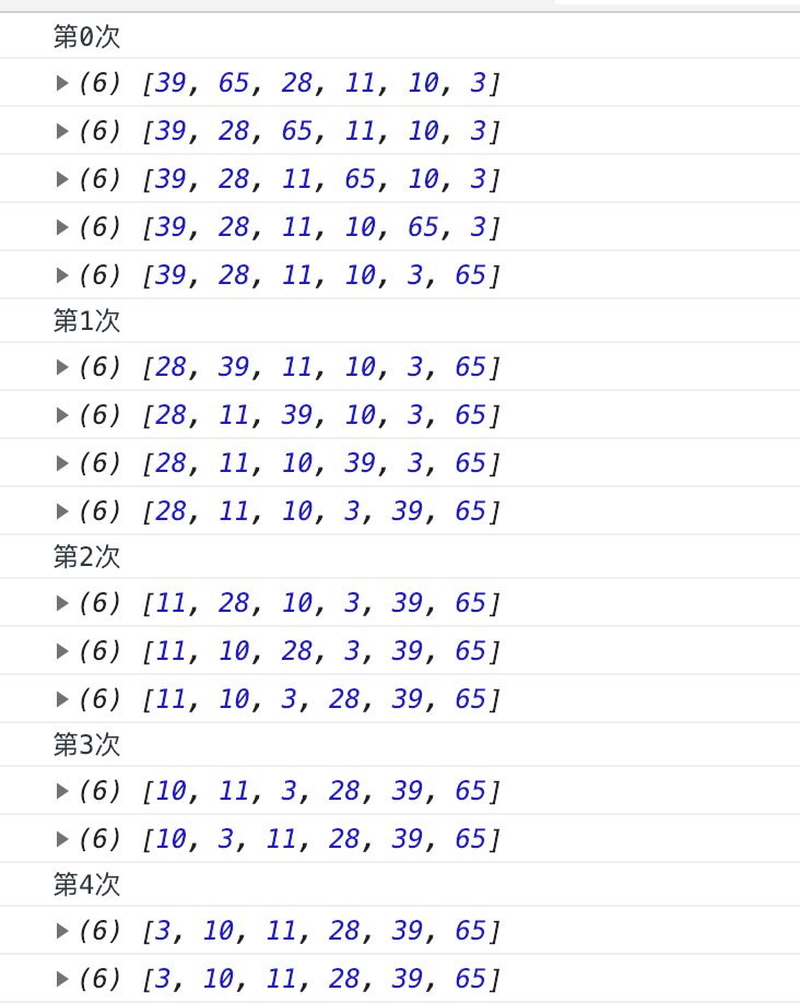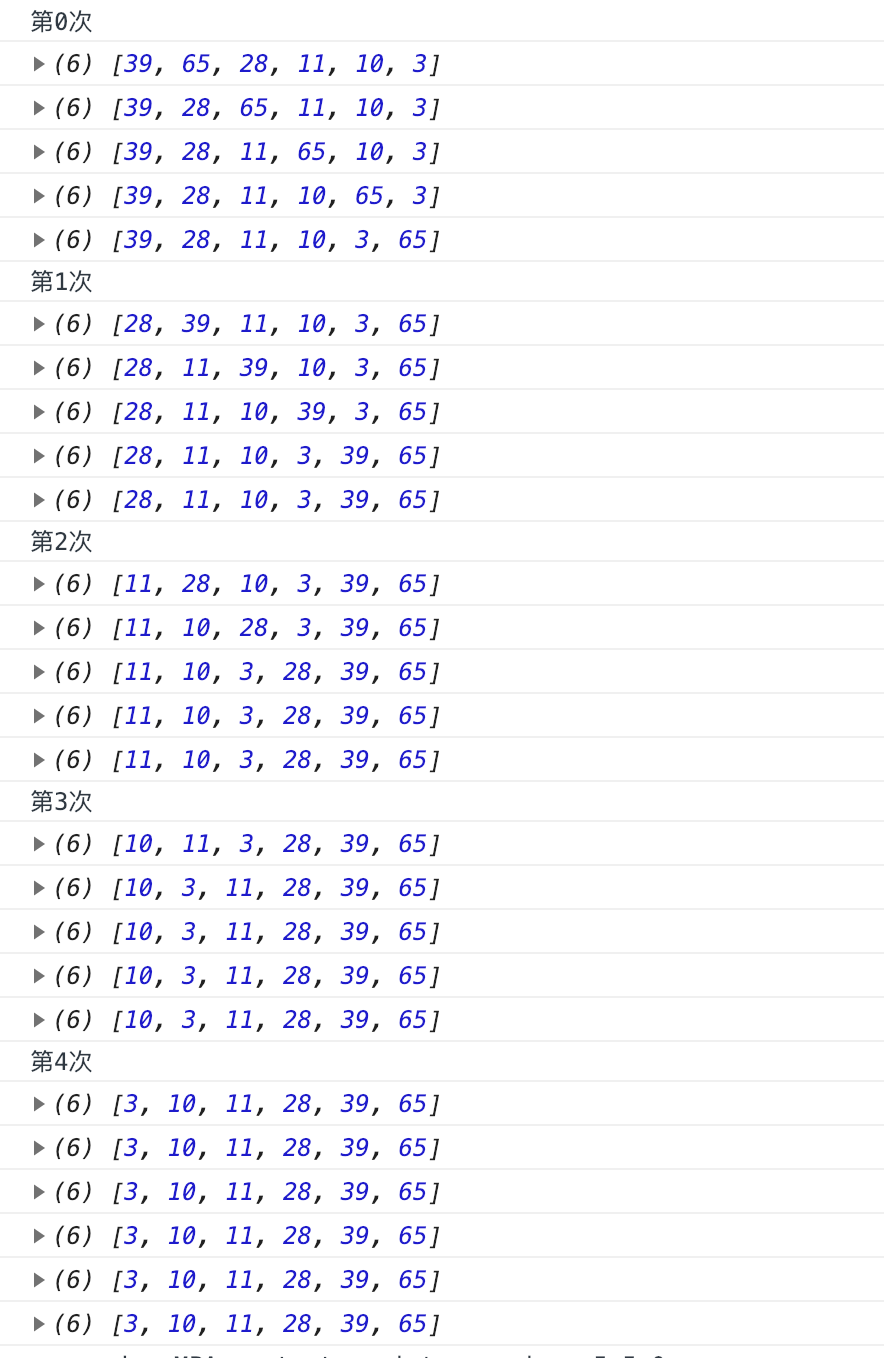 当i=1的时候,里面的循环再次完整执行,由于最大的数已经在最后了,没有必要去比较数组的最后两项,所以可以做一下优化: