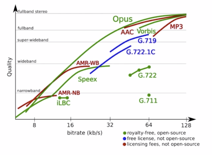 (2)从频带方面看,G.711、G.722、AMR和iLBC等标准适用于narrowband(8khz采样率)和wideband(16khz采样率)范围,针对普通的语音通话场景。AAC和MP3适用于fullband(48khz采样率)范围,针对特殊的音乐场景。而Opus适用于整个频带,可以进行最大范围的动态调节,适用范围最广。