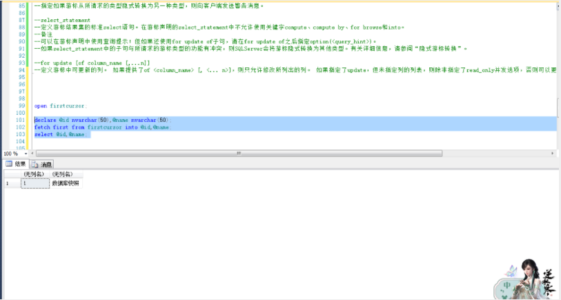 --定义游标结果集的标准select语句。在游标声明的select_statement中不允许使用关键字compute、compute by、for browse和into。