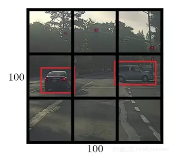 在为此网格编写y标签之前,首先要了解YOLO如何确定网格中是否存在实际对象。大图中有两个物体(两辆车),因此YOLO将取这两个物体的中心点,物体将被分配到包含这些物体中心的网格中。中心点左侧网格的y标签会是这样的: