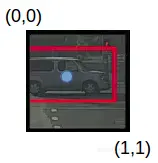 如前所述,bx、by、bh和bw是相对于正在处理的网格单元计算而言的。下面通过一个例子来说明这一点。以包含汽车的右边网格为例: