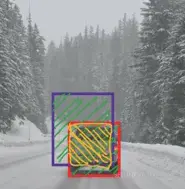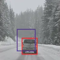 其中,红色框是实际的边界框,蓝色框是预测的边界框。如何判断它是否是一个好的预测呢?IoU将计算这两个框的并集交叉区域:
