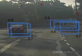 - 2.现在,它会查看图像中的所有其他框。与当前边界框较高的IoU的边界框将被抑制。因此,在示例中,0.6和0.7概率的边界框将被抑制: