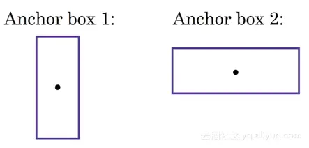 上述方法只会获得两个边界框其中的一个,但是如果使用Anchor Boxes,可能会输出两个边界框!我们该怎么做呢?首先,预先定义两种不同的形状,称为Anchor Boxes。对于每个网格将有两个输出。这里为了易于理解,这里选取两个Anchor Boxes,也可以根据实际情况增加Anchor Boxes的数量: