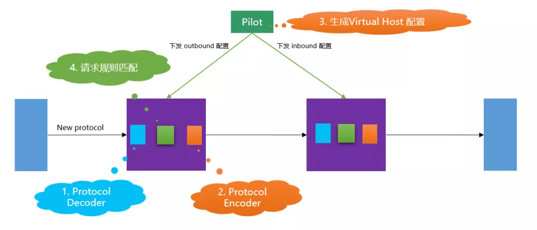 在上述需要在协议扩展时修改的四个内容中,有一块是特别的:生成 Virtual Host 配置的工作是在 Pilot 中实现的,而其他三个是在 Sidecar ( Envoy 或 MOSN )中。考虑到 protocol encoder 和 protocol decoder 的工作是必不可少的,必然会修改Sidecar来增加实现代码,因此简化开发的第一个想法就是:能不能做到不修改Pilot?