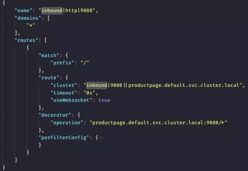 outbound 配置中,注意 domains 字段是各种域名和ClusterIP,而 routes 中,match是通过prefix来匹配。我们结合HTTP/1.1,domains字段是用来和请求的Host header进行域名匹配的,比如 Host: istio-telemetry,这决定了哪些请求是要转发到 istio-telemetry 这个服务的。routes的match用来进行路由匹配的,通过HTTP请求的path进行匹配。