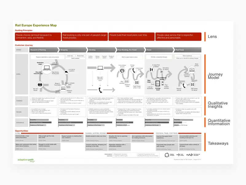 上图中是欧洲铁路公司整个体验地图的一部分。欧洲铁路公司是一家美国经销商,为北美旅客提供一个独立预订火车票去欧洲各地的平台,而无需用户去网站预定。他们已经拥有了一个良好体验的网站和一个屡获殊荣的咨询中心,但他们希望通过所有接触点来优化用户使用过程,这样可以让他们更全面地了解,他们应该专注的投资,设计和技术资源。整体的“诊断”评价系统,包含一系列的重点举措,体验地图只是其中派生的一部分。体验地图帮助建立同理心图,来理解随着时间和空间的推移,用户与欧洲铁路公司服务系统交互时接触点的变化。