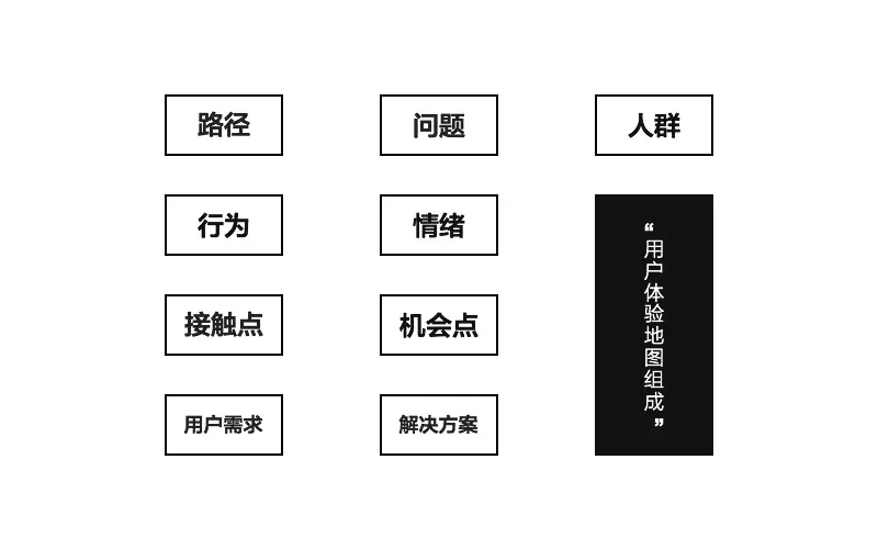 其中包括,人群(产品的用户是哪一类人)、 用户的需求(用户想得到什么)、 路径(在某特定的场景下体验的整体过程) 、接触点 (产品与人或人与服务接触的关键点)、行为(用户的行为是什么样的?)、情绪 (体验过程中的感受心情) 、机会点 (过程中可以突破的点,可以成为特色的地方)、 解决方案 (解决用户在体验过程的痛点)、 问题 (解决用户在体验过程的痛点)。