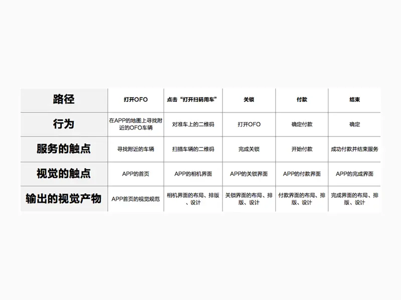 上图为使用OFO进行骑行的用户体验地图,那我们看看作为一名视觉设计师应该关注哪部分的流程。