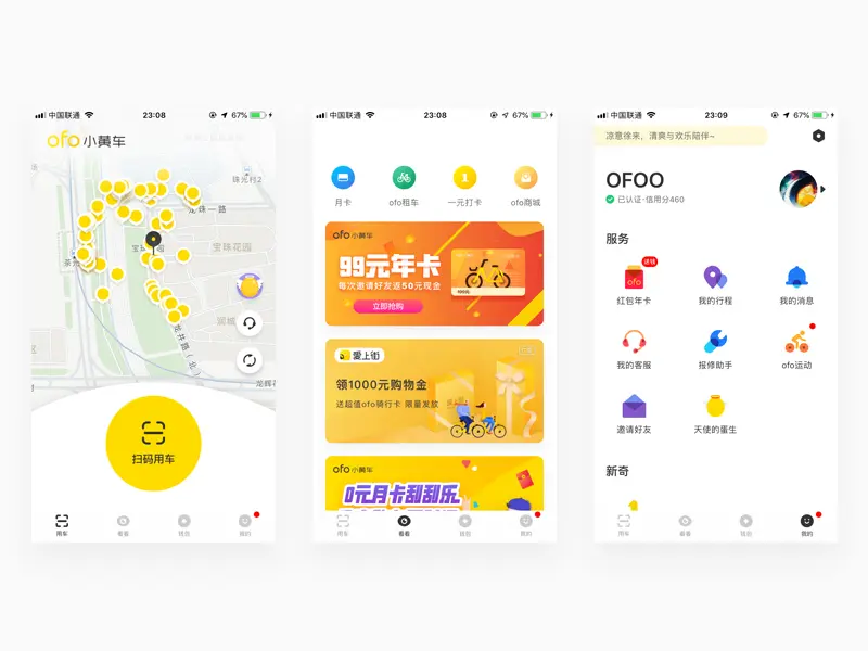 OFO,以年轻人为主的共享骑行产品,无论是在品牌/运营/UI的设计上,都能让人感觉时尚、年轻、阳光、且有亲和力。