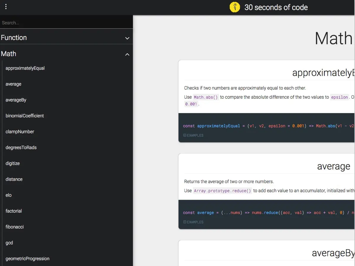 恭喜你,现在你已经能够独立解决问题了。你在解决问题的时候,会发现你大部分时间不是花在解决这个问题,而是在做一些字符串,数组的处理。慢慢你会觉得这些变成了体力活,而这些体力活正在消耗你的精力。这个时候我建议你可以尝试用一些库,一些提供常用方法的库,不要自己再重复造轮子。但我觉得更方便的方法是,从这个网站 “30 seconds of code" 找到自己想要的方法,粘贴过来直接使用。这上面提供的方法都非常实用,而且代码都很精炼,也是一个很好的学习资源,而且还有多语言版本。