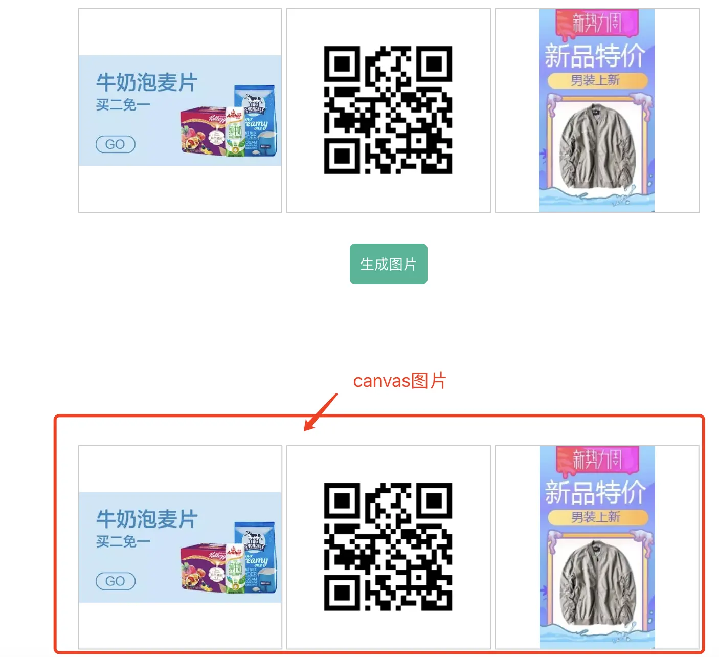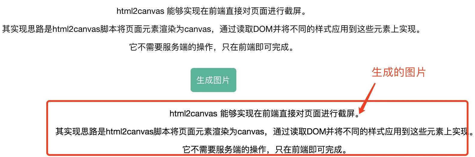 然后在js文件中,generatorImage方法实现html到图片的转换,此时即可看到页面尾部已经添加了生成的图片内容,也可以对图片转为base64编码并下载到本地。