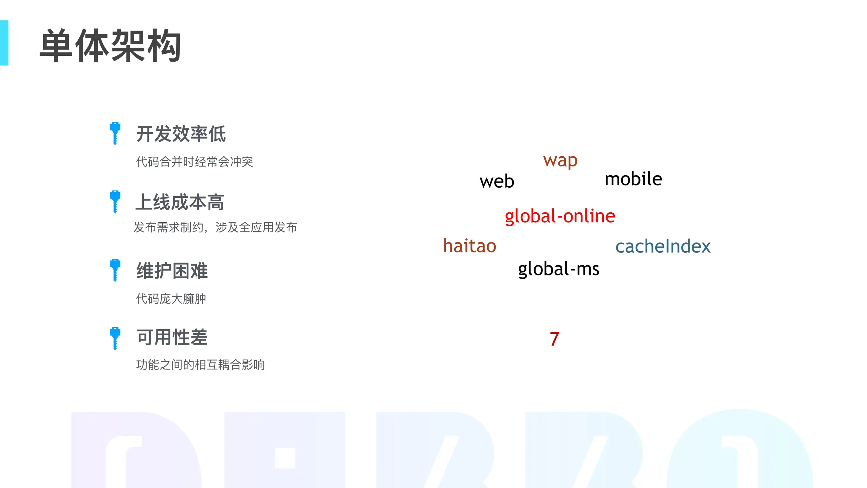 再例如上线成本高:几乎所有的发布需求都会涉及到这些应用的上线,同时不断增长的业务需求,也会使得我们的代码越来越臃肿,造成维护困难、可用性差,功能之间相互耦合,都耦合在一个进程里面,导致一旦某一个业务需求涉及的代码或者资源出现问题,那么就会影响其他的业务。比如说我们曾经在online工程里面,因为优惠券兑换热点的问题,影响了核心的下单服务。